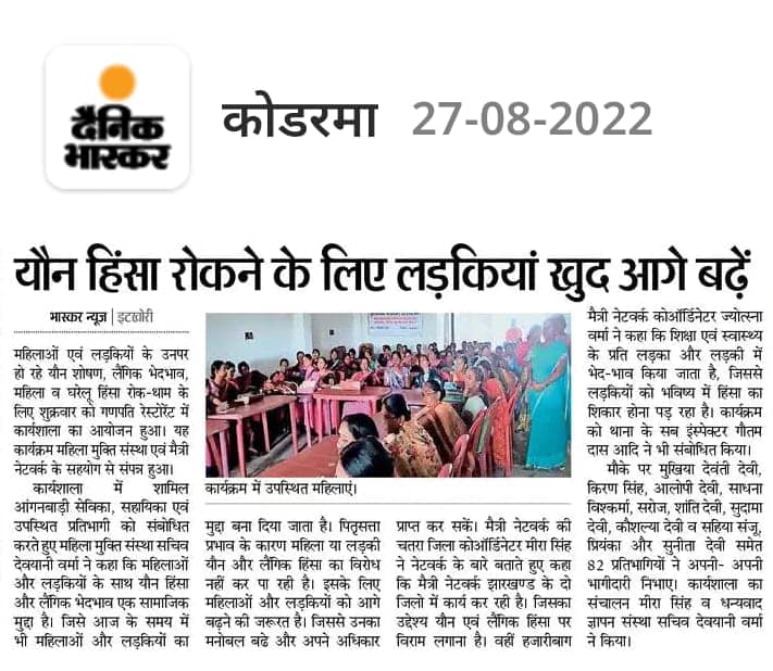 Mahila Mukti Sanstha is pledged to work to change the societal attitude and behaviour toward the social evils that are taken for granted through the medium of education, folk song, street plays and counselling and health care in the target group of rural areas of Hazaribagh District in Jharkhand.