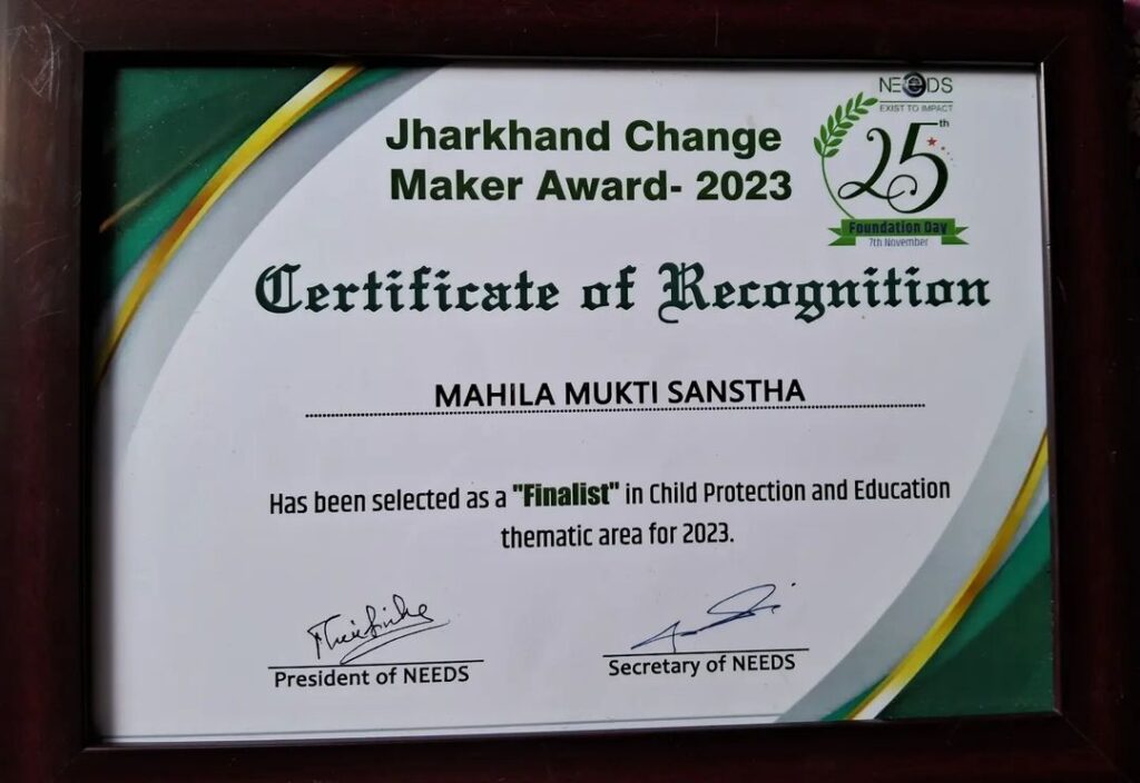Jharkhand Change maker Award-2023 received from NEEDS in child Protection and Education thematic area for 2023.